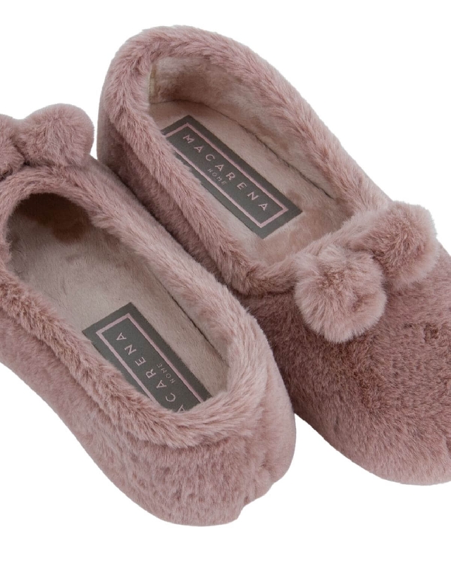 Pantofole in pelle di agnello sintetica, decorate con due pon-pon su ciascun piede. Altezza suola 1 cm. Soletta rimovibile in poliuretano. Il colore dell'articolo può variare leggermente a seconda del dispositivo utilizzato per la navigazione.