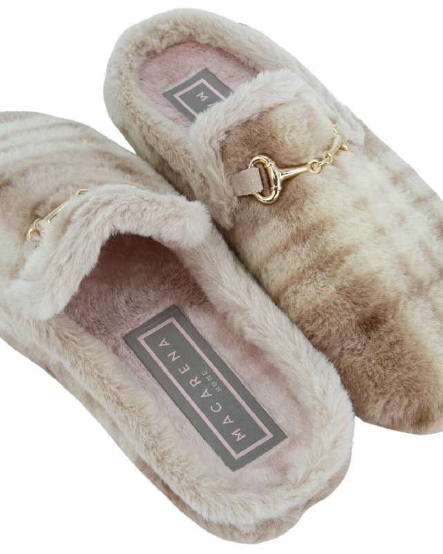 Pantofole in morbida pelliccia di orsetto, multicolore e decorate con una fibbia in metallo dorato. Altezza suola 1 cm. Soletta rimovibile in poliuretano. Il colore dell'articolo può variare leggermente a seconda del dispositivo utilizzato per la navigazione.