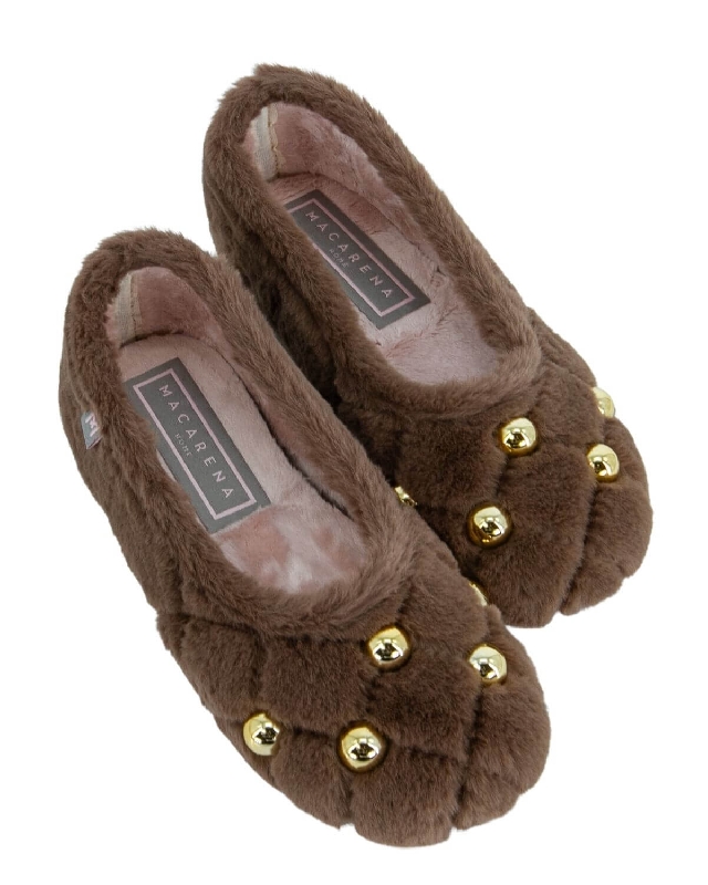 Pantofole in morbida pelliccia lunga, ricamate e decorate con borchie tonde dorate. Altezza suola 1 cm. Soletta rimovibile in poliuretano. Il colore dell'articolo può variare leggermente a seconda del dispositivo utilizzato per la navigazione.