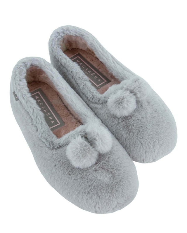 Pantofole in pelle di agnello sintetica, decorate con due pon-pon su ciascun piede. Altezza suola 1 cm. Soletta rimovibile in poliuretano. Il colore dell'articolo può variare leggermente a seconda del dispositivo utilizzato per la navigazione.