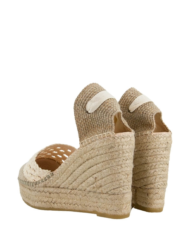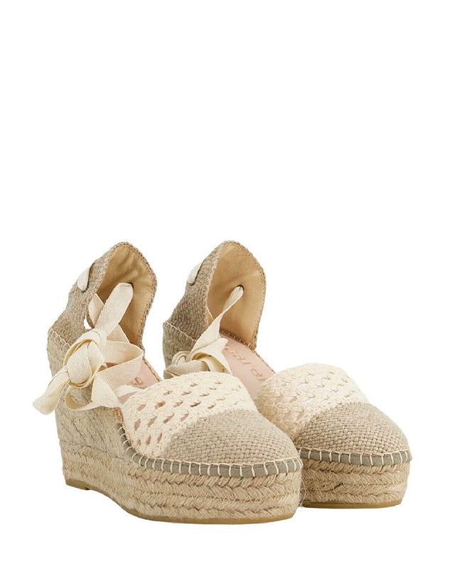 Espadrillas con zeppa alta e lacci alle caviglie.