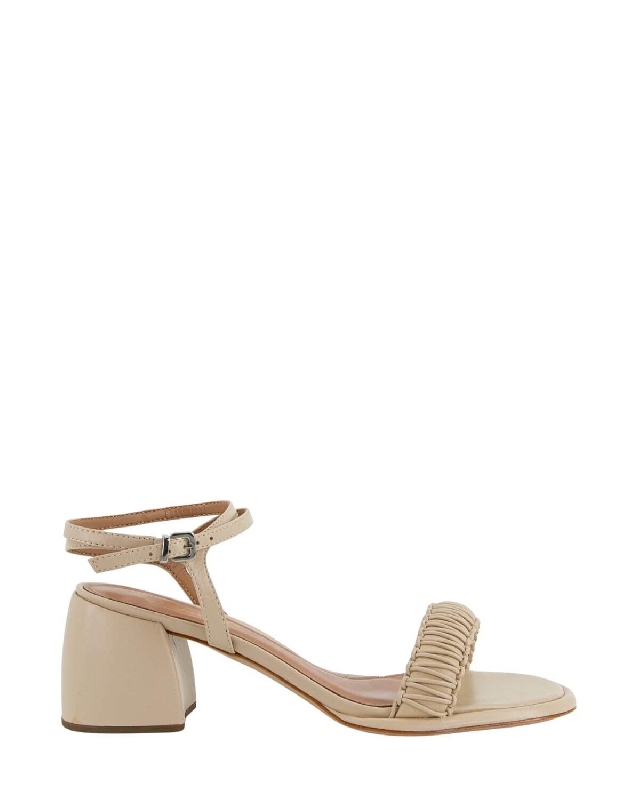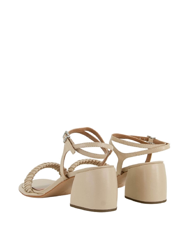 Sandali in pelle con fascetta lavorata in pelle. Cinturino regolabile con fibbia alla caviglia. Tacco rivestito in pelle.