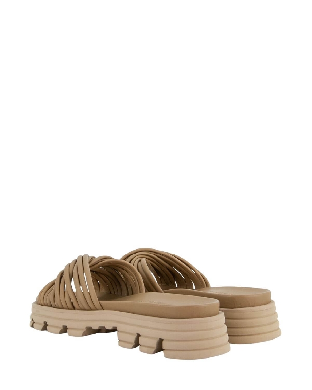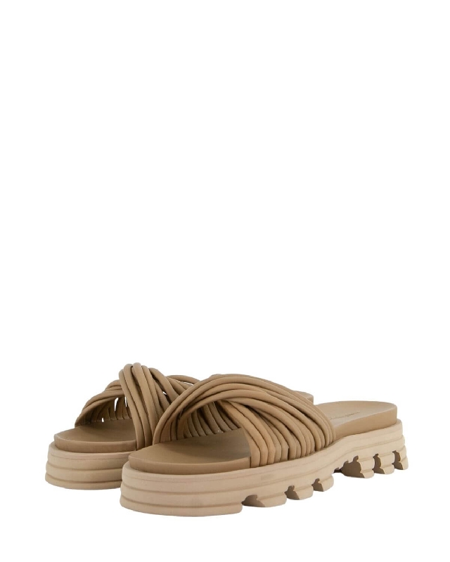 Mule in pelle con fascette attorcigliate. Suola rialzata e in gomma.