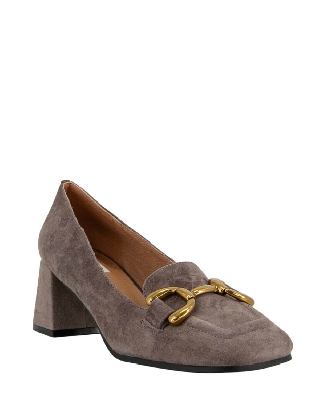 Mocassini in pelle scamosciata. Tacco largo. Accessorio morsetto gold. Punta quadra.