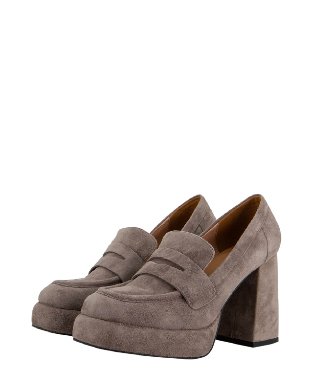 Mocassini in pelle scamosciata. Tacco alto e largo. Punta quadra.