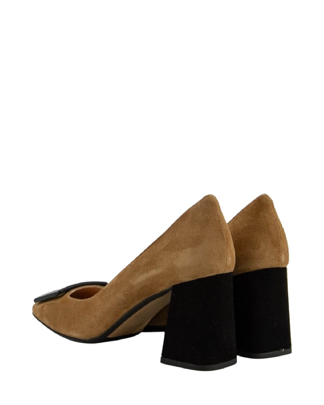 Scarpe in pelle scamosciate con accessorio. Punta quadrata. Tacco largo.