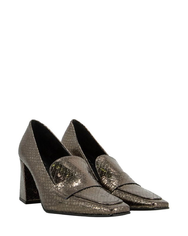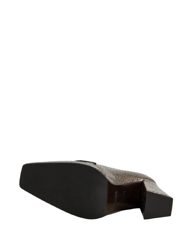 Scarpe in pelle con stampa pitonata. Punta quadra. Tacco largo.