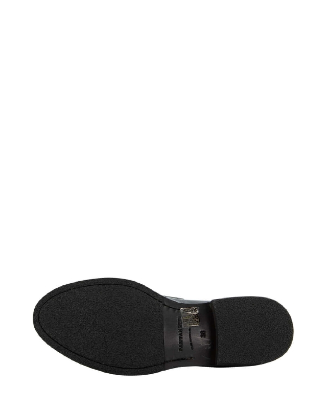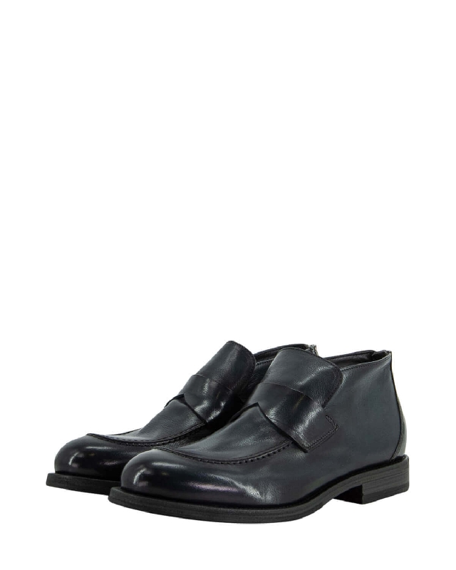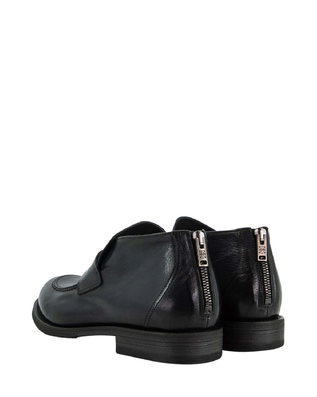 Pantofolone con zip posteriore, forma tonda con tacco 20 in pelle di bufalo tamponata a mano. Lavorazione Black rapid