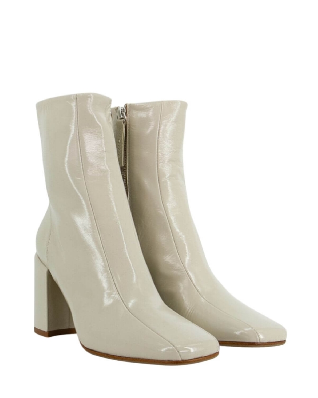 Scarpe in pelle. Scarpe laccate lucide. Tacco largo. Punta squadrata. Chiusura con zip laterale.