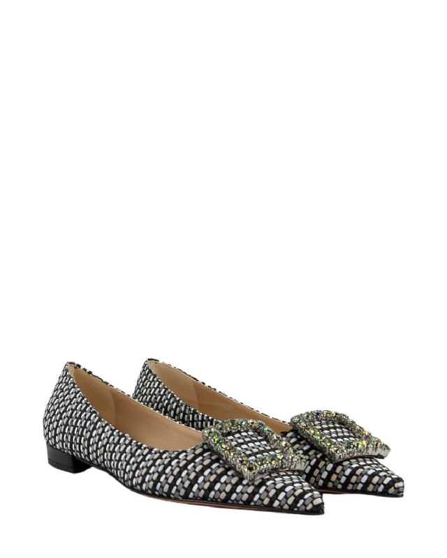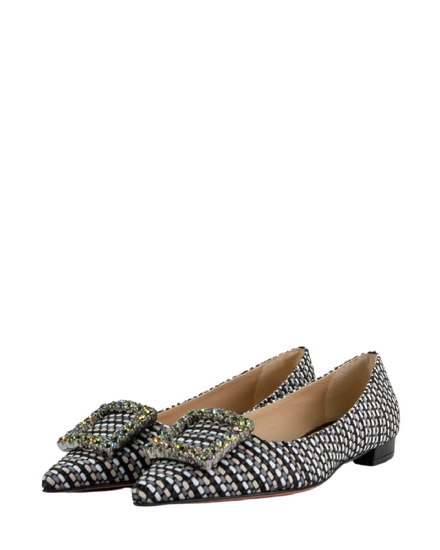 La ballerina flat Amaia, realizzata con raffia intrecciata e impreziosita da una fibbia con strass in tinta con la tomaia e da un tacco basso strutturato da 1 cm. Un classico must have per la donna moderna.