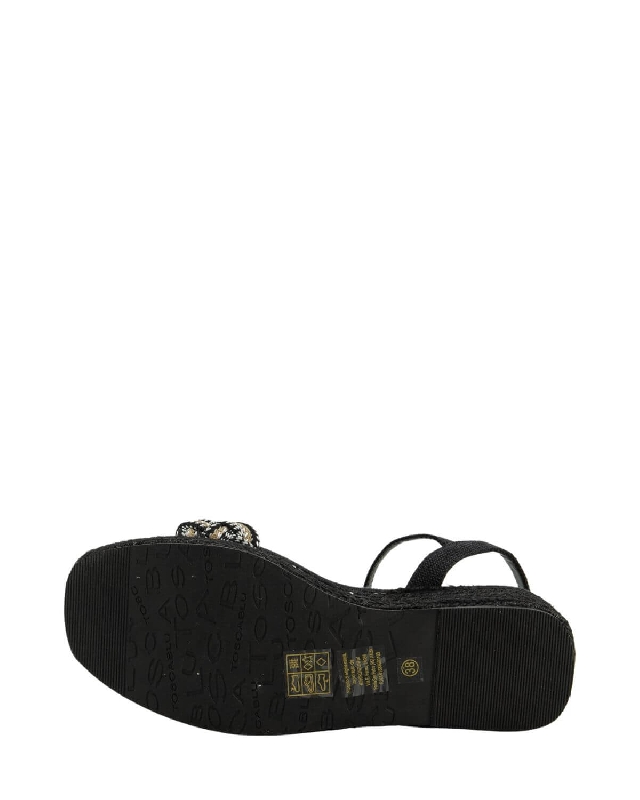 Scarpe in tessuto. Tacco con zeppa. Suola in gomma. Chiusura con cinturino.