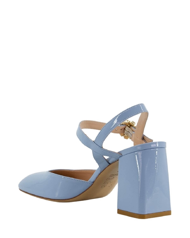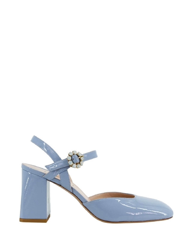 Scarpe in pelle. Scarpe laccate lucide. Tacco largo. Suola in cuoio. Chiusura con cinturino.