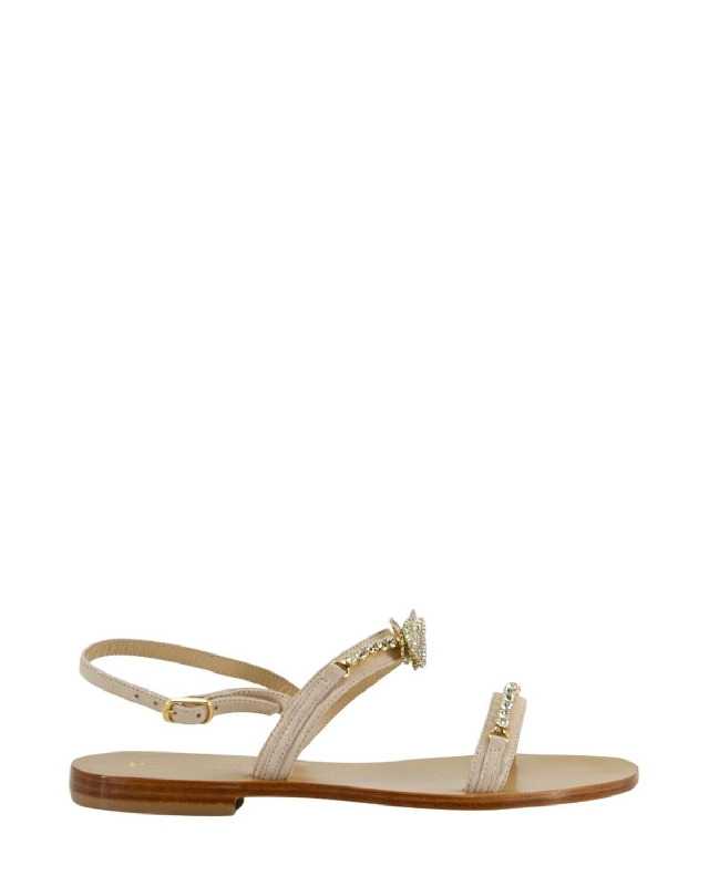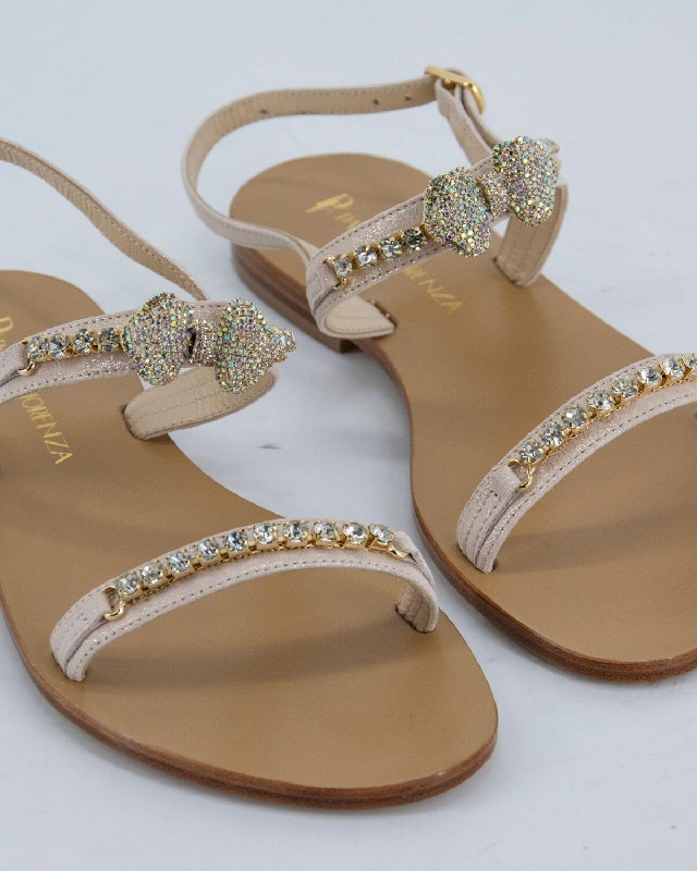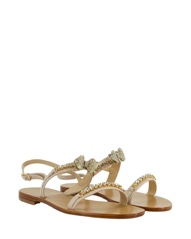 Questo sandalo è interamente realizzato in morbida pelle,  presenta una tomaia impreziosita da gioielli. Suola in cuoio toscano con logo.