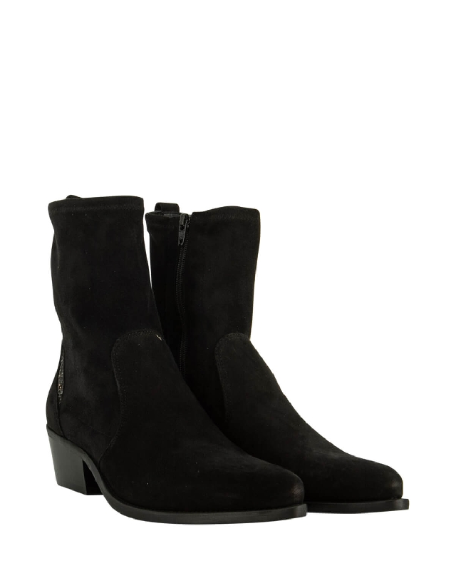 Stivaletto in nabuk nero con tacco, zip interna, fodera in pelle ed elemento decorativo color bronzo sul retro. Scarpe in pelle. Tacco medio. Scarpe a punta. Suola in gomma. Chiusura con zip laterale. Il colore dell'articolo può variare leggermente a seconda del dispositivo utilizzato per la navigazione.