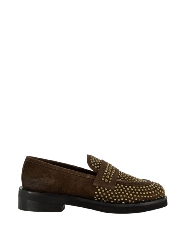 Scarpe in pelle scamosciate. Tacco basso. Punta tonda. Suola in gomma. Senza lacci. Il colore dell'articolo può variare leggermente a seconda del dispositivo utilizzato per la navigazione.