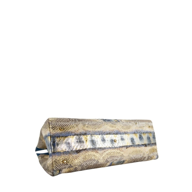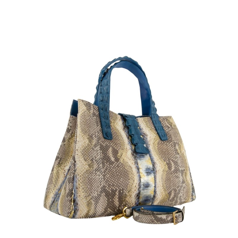 Borsa shopping in vera pelle di pitone con rifiniture in vera pelle di coccodrillo selvaggio. Bottone magnetico di chiusura. Tracolla inclusa. Doppi manici in pelle di coccodrillo selvaggio. Fodera interna in alcantara
