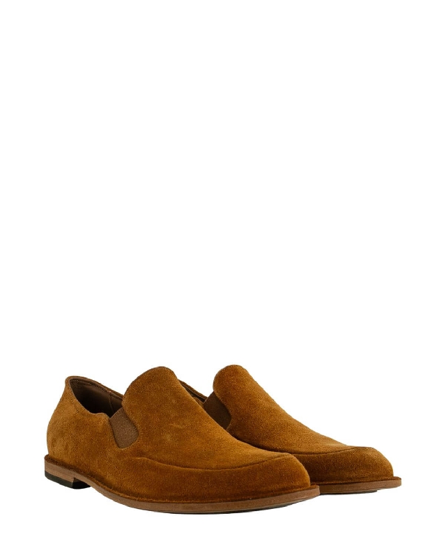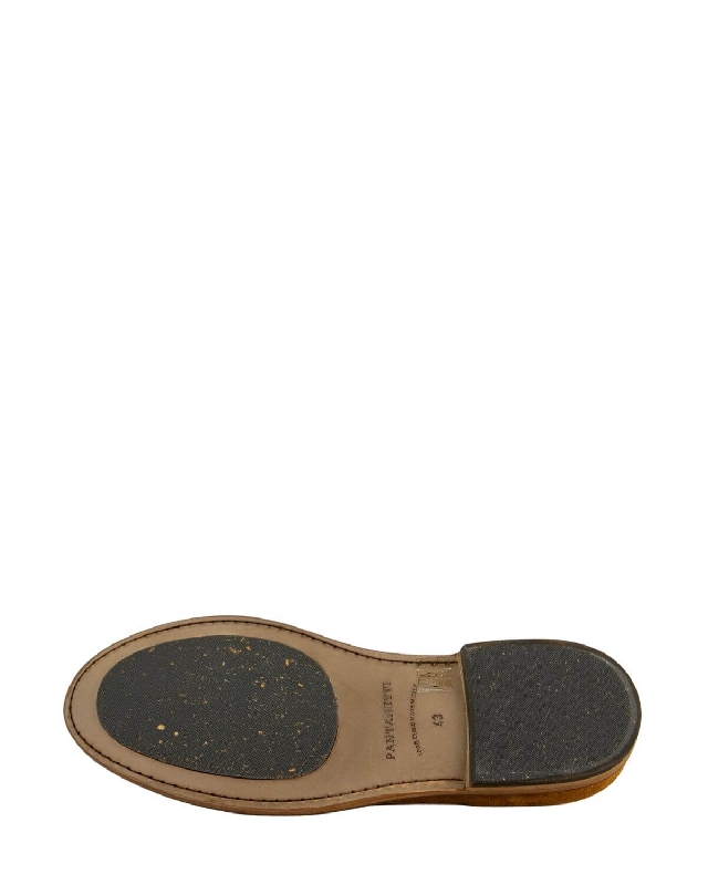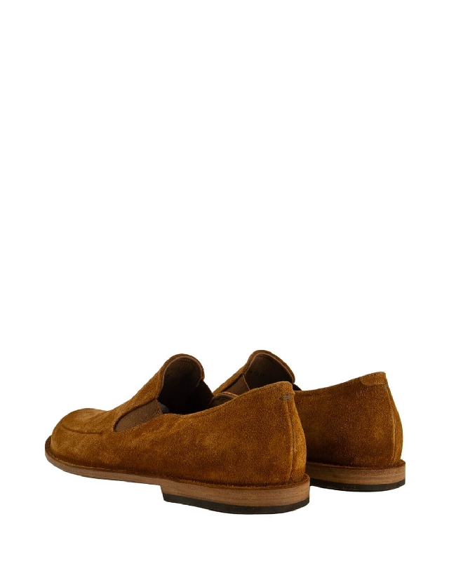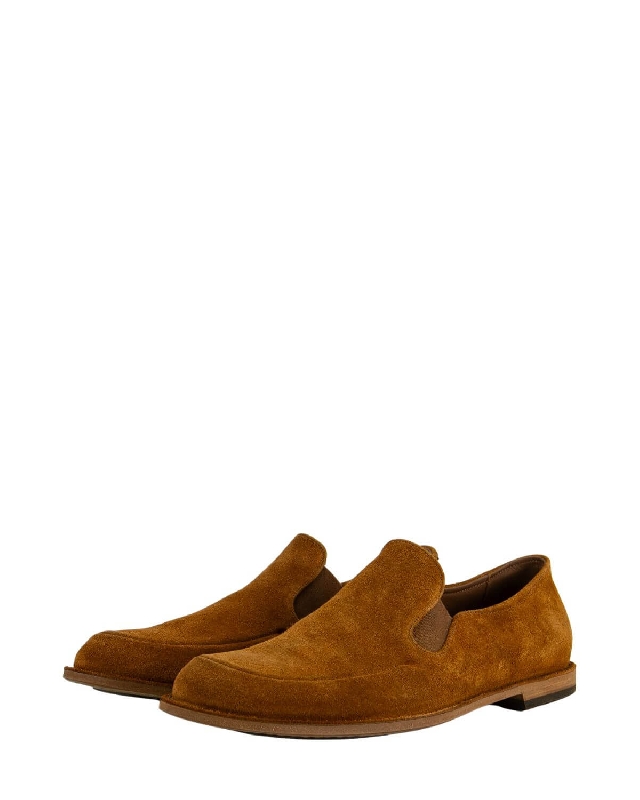 Mocassini in pelle scamosciata con inserti elasticizzati laterali. Punta tonda. Suola in cuoio e gomma.